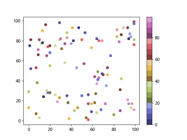 # 以下三行代码使编译器支持绘图功能: import sys import matplotlib matplotlib.use('Agg') import matplotlib.pyplot as plt import numpy as np # 生成随机数据: x = np.random.randint(100, size=(100)) y = np.random.randint(100, size=(100)) colors = np.random.randint(100, size=(100)) # 使用 tab20b 离散配色方案创建散点图: plt.scatter(x, y, c=colors, cmap='tab20b') plt.colorbar() plt.show() # 以下两行代码使编译器能够输出图形: plt.savefig(sys.stdout.buffer) sys.stdout.flush()