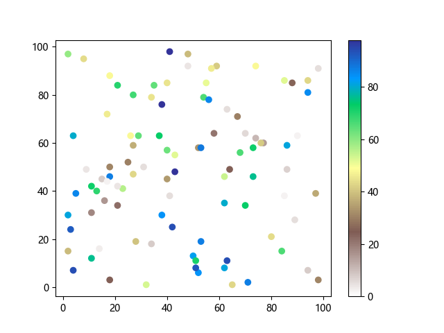 # 以下三行代码使编译器支持绘图功能: import sys import matplotlib matplotlib.use('Agg') import matplotlib.pyplot as plt import numpy as np # 生成随机数据: x = np.random.randint(100, size=(100)) y = np.random.randint(100, size=(100)) colors = np.random.randint(100, size=(100)) # 使用地形反向 (terrain_r) 配色方案创建散点图: plt.scatter(x, y, c=colors, cmap='terrain_r') plt.colorbar() plt.show() # 以下两行代码使编译器能够输出图形: plt.savefig(sys.stdout.buffer) sys.stdout.flush()