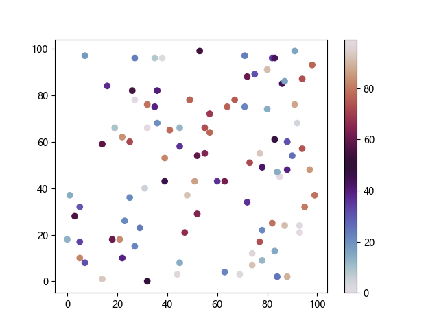 # 以下三行代码使编译器支持绘图功能: import sys import matplotlib matplotlib.use('Agg') import matplotlib.pyplot as plt import numpy as np # 生成随机数据: x = np.random.randint(100, size=(100)) y = np.random.randint(100, size=(100)) colors = np.random.randint(100, size=(100)) # 使用 twilight 配色方案创建散点图: plt.scatter(x, y, c=colors, cmap='twilight') plt.colorbar() plt.show() # 以下两行代码使编译器能够输出图形: plt.savefig(sys.stdout.buffer) sys.stdout.flush()