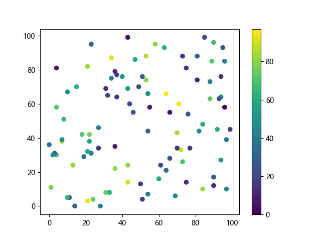 # 以下三行代码使编译器支持绘图功能: import sys import matplotlib matplotlib.use('Agg') import matplotlib.pyplot as plt import numpy as np # 生成随机数据: x = np.random.randint(100, size=(100)) y = np.random.randint(100, size=(100)) colors = np.random.randint(100, size=(100)) # 使用 viridis 配色方案创建散点图: plt.scatter(x, y, c=colors, cmap='viridis') plt.colorbar() plt.show() # 以下两行代码使编译器能够输出图形: plt.savefig(sys.stdout.buffer) sys.stdout.flush()