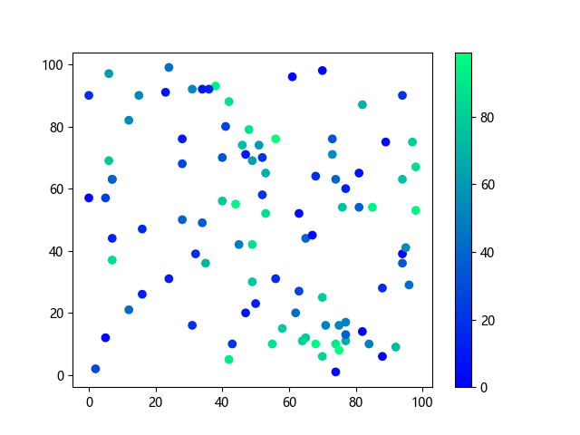# 以下三行代码使编译器支持绘图功能: import sys import matplotlib matplotlib.use('Agg') import matplotlib.pyplot as plt import numpy as np # 生成随机数据: x = np.random.randint(100, size=(100)) y = np.random.randint(100, size=(100)) colors = np.random.randint(100, size=(100)) # 使用冬季 (winter) 配色方案创建散点图: plt.scatter(x, y, c=colors, cmap='winter') plt.colorbar() plt.show() # 以下两行代码使编译器能够输出图形: plt.savefig(sys.stdout.buffer) sys.stdout.flush()