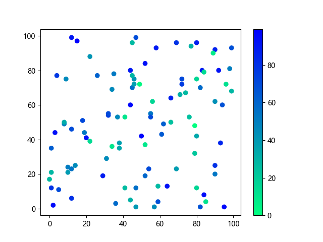 # 以下三行代码使编译器支持绘图功能: import sys import matplotlib matplotlib.use('Agg') import matplotlib.pyplot as plt import numpy as np # 生成随机数据: x = np.random.randint(100, size=(100)) y = np.random.randint(100, size=(100)) colors = np.random.randint(100, size=(100)) # 使用冬季反向 (winter_r) 配色方案创建散点图: plt.scatter(x, y, c=colors, cmap='winter_r') plt.colorbar() plt.show() # 以下两行代码使编译器能够输出图形: plt.savefig(sys.stdout.buffer) # 将图形保存到标准输出缓冲区 sys.stdout.flush() # 刷新输出缓冲区