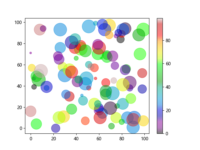 # 以下三行代码使编译器支持绘图功能: import sys import matplotlib matplotlib.use('Agg') import matplotlib.pyplot as plt import numpy as np # 生成随机数据: x = np.random.randint(100, size=(100)) y = np.random.randint(100, size=(100)) colors = np.random.randint(100, size=(100)) sizes = 10 * np.random.randint(100, size=(100)) # 点大小(10-990随机值) # 使用光谱配色、半透明效果创建散点图: plt.scatter(x, y, c=colors, s=sizes, alpha=0.5, cmap='nipy_spectral') plt.colorbar() plt.show() # 以下两行代码使编译器能够输出图形: plt.savefig(sys.stdout.buffer) sys.stdout.flush()