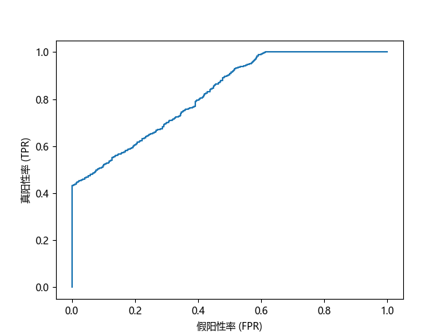 # 这三行代码使编译器能够绘图: import sys import matplotlib matplotlib.use('Agg') import numpy as np import matplotlib.pyplot as plt from sklearn.metrics import accuracy_score, confusion_matrix, roc_auc_score, roc_curve n = 10000 ratio = .95 n_0 = int((1-ratio) * n) # 少数类样本数 n_1 = int(ratio * n) # 多数类样本数 y = np.array([0] * n_0 + [1] * n_1) # 真实标签 # 从假设模型中获取的概率值(不总是预测众数类): y_proba_2 = np.array( np.random.uniform(0, .7, n_0).tolist() + # 类别 0 的预测概率 np.random.uniform(.3, 1, n_1).tolist() # 类别 1 的预测概率 ) y_pred_2 = y_proba_2 > .5 # 以 0.5 为阈值生成预测标签 def plot_roc_curve(true_y, y_prob): """ 根据预测概率绘制 ROC 曲线 """ fpr, tpr, thresholds = roc_curve(true_y, y_prob) plt.plot(fpr, tpr) plt.xlabel('假阳性率 (FPR)') plt.ylabel('真阳性率 (TPR)') # 绘制 ROC 曲线并输出 AUC 分数: plot_roc_curve(y, y_proba_2) print(f'模型 2 AUC 分数: {roc_auc_score(y, y_proba_2)}') # 这两行代码使编译器能够输出图形: plt.savefig(sys.stdout.buffer) sys.stdout.flush()