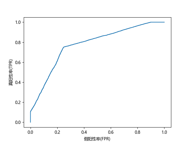 # 这三行代码使编译器支持绘图功能: import sys import matplotlib matplotlib.use('Agg') import numpy as np import matplotlib.pyplot as plt from sklearn.metrics import accuracy_score, confusion_matrix, roc_auc_score, roc_curve n = 10000 y = np.array([0] * n + [1] * n) # 生成两种概率预测值: y_prob_1 = np.array( np.random.uniform(.25, .5, n//2).tolist() + np.random.uniform(.3, .7, n).tolist() + np.random.uniform(.5, .75, n//2).tolist() ) y_prob_2 = np.array( np.random.uniform(0, .4, n//2).tolist() + np.random.uniform(.3, .7, n).tolist() + np.random.uniform(.6, 1, n//2).tolist() ) def plot_roc_curve(true_y, y_prob): """ 根据预测概率绘制ROC曲线 """ fpr, tpr, thresholds = roc_curve(true_y, y_prob) plt.plot(fpr, tpr) plt.xlabel('假阳性率(FPR)') plt.ylabel('真阳性率(TPR)') # 绘制第一种概率预测的 ROC 曲线: plot_roc_curve(y, y_prob_1) # 这两行代码使编译器能够输出图形: plt.savefig(sys.stdout.buffer) sys.stdout.flush()