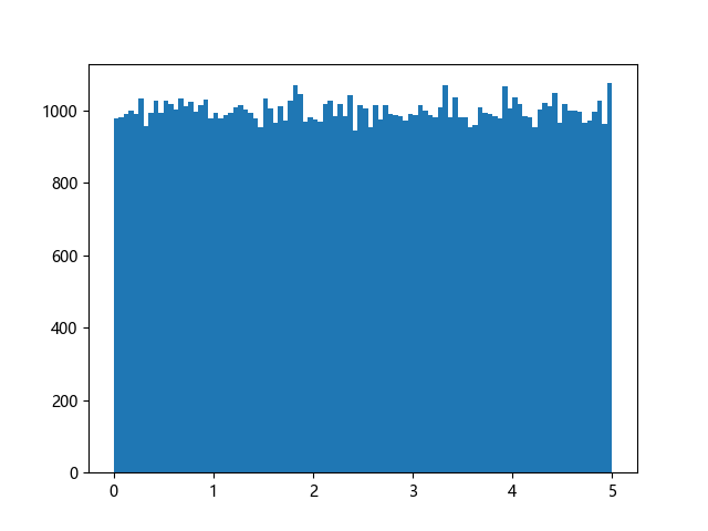 # 使编译器支持绘图的三行配置: import sys import matplotlib matplotlib.use('Agg') import numpy import matplotlib.pyplot as plt x = numpy.random.uniform(0.0, 5.0, 100000) plt.hist(x, 100) plt.show() # 实现编译器绘图功能的两行代码: plt.savefig(sys.stdout.buffer) sys.stdout.flush()