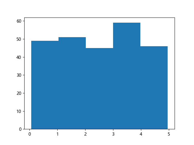 # 使我们的编译器能够绘制的三行代码: import sys import matplotlib matplotlib.use('Agg') import numpy import matplotlib.pyplot as plt x = numpy.random.uniform(0.0, 5.0, 250) plt.hist(x, 5) plt.show() # 使我们的编译器能够绘制的两行代码: plt.savefig(sys.stdout.buffer) sys.stdout.flush()