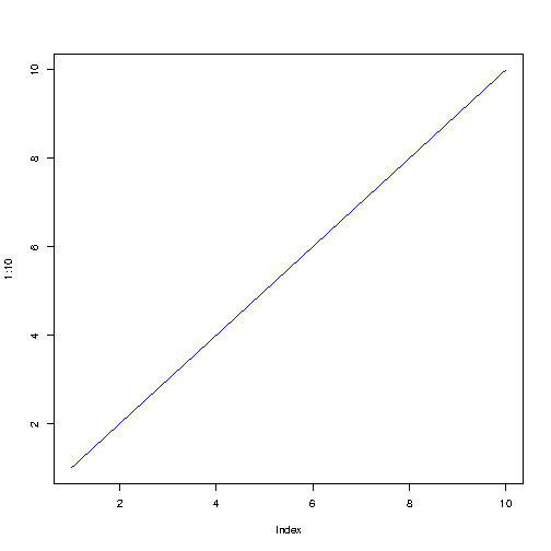 line1 <- c(1,2,3,4,5,10) line2 <- c(2,5,7,8,9,10) plot(line1, type = "l", col = "blue") lines(line2, type="l", col = "red")
